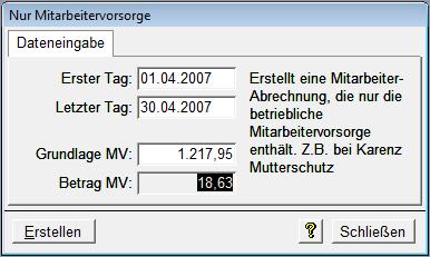 In diesem Fenster erstellen Sie Mitarbeiterabrechnungen, die nur aus einer MV (betriebliche Mitarbeitervorsorge) bestehen.